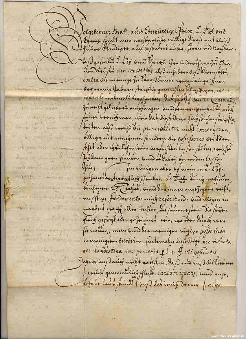Johannes V. Dressel, Abt von Ebrach (1618-1637), Brief mit eigenhändiger Unterschrift, Ebrach 26. August 1626. Deutsche Handschrift auf Papier, 1½ SS. auf 2 Bll., Folio, ca. 32,5 × 20,6 cm. Mit papiergedecktem Ringsiegel. Leicht angeschmutzt, kleinere Einrisse an Faltstellen, Siegelpapier mit kleiner Fehlstelle. - € 180