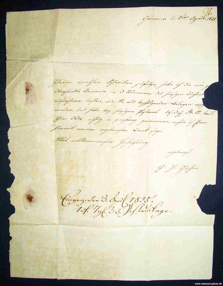 Georg Joachim Göschen, deutscher Verleger (1752-1828), eigenhändiger Brief mit Unterschrift, Grimma, 2. April 1825. Deutsche Handschrift auf Papier, 1 S. auf 1 Bl., ca. 25 × 19 cm. Zwei Lacksiegel. Altersgebräunt, öffnungsbedingt kleine Randausrisse. - € 240