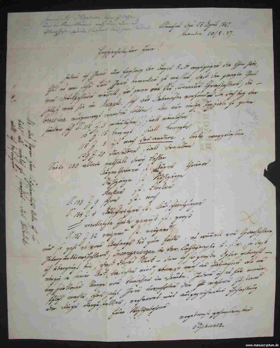 Franz Ignaz Pruner, deutscher Mediziner, Ophthalmologe, Epidemiologe und Anthropologe (1808-1882), eigenhändiger Brief mit Unterschrift, München, 28. April 1847. Dt. Handschrift auf Papier ("Bath"), ca. 27 × 21,9 cm, 1S. auf 1 Bl. Minimal angeschmutzt bzw. wasserfleckig. - € 320.