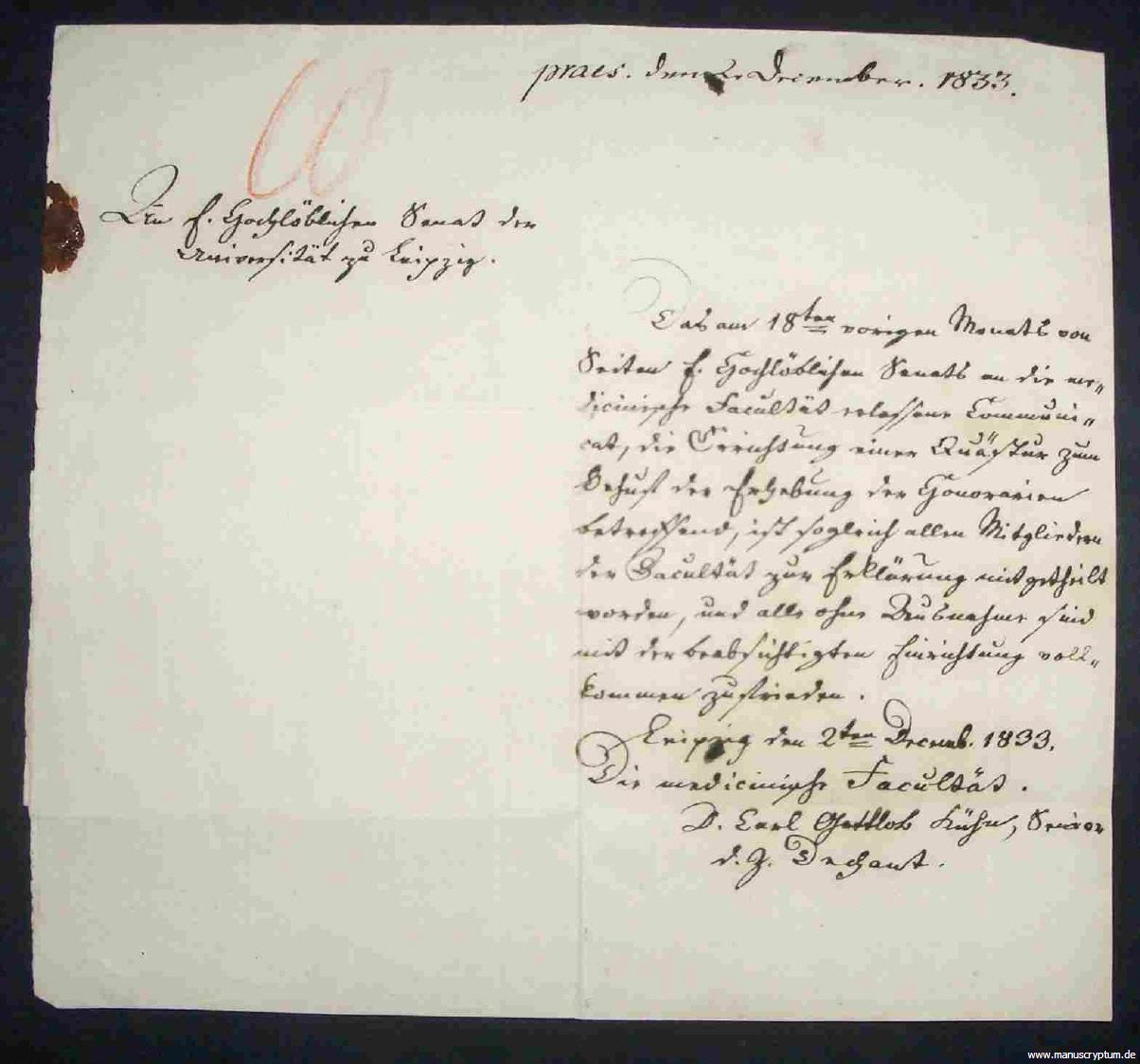 Als Dekan der Medizinischen Fakultät der Universität Leipzig an den Senat der Universität, den er unterrichtet, dass dessen "Communicat, die Errichtung einer Quästur zum Behuf der Erhebung der Honorarien" von der Medizinischen Fakultät einmütig gebilligt worden sei.