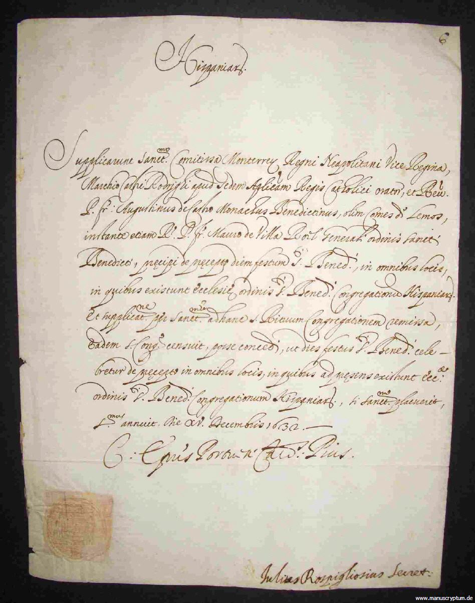 Clemens IX., Papst, Theologe, Opernlibrettist (1600-1669), Dokument mit eigenhändiger Unterschrift als Sekretär der Ritenkongregation, [Rom] 15. Dezember 1632. Lateinische Handschrift auf Papier, ca. 26,5 × 20 cm, 1 S. auf 2 Bll., papiergedecktes Siegel, minimal braunfleckig, kleine Randunregelmäßigkliten. - € 780