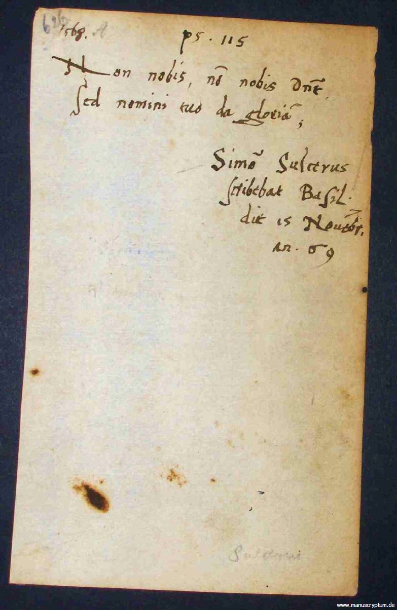 Sulzer zitiert den Psalm 115 ("Non nobis, non nobis Domine sed nomino tuo da gloriam"). - Simon Sulzer wurde als Sohn des Propstes von Interlaken im Berner Schattenhalb geboren. Nach dem Schulbesuch in Bern und Luzern studierte er in Straßburg und Basel u.a. bei Martin Bucer und Wolfgang Capito. Ab 1533 wirkte er in Bern, zunächst als Lehrer, bald jedoch als Pfarrer und Haupt der Berner Geistlichkeit. Nach zähen Kämpfen wurde Sulzer 1548 durch die Anhänger von Zwingli vertrieben und erhielt im Folgejahr in Basel ein Pfarramt. Dort übernahm er 1552 die Professur für Hebräisch des verstorbenen Sebastian Münster und rückte 1553 zum Antistes der Kirche von Basel auf. Im Jahr 1556 wurde er zusätzlich Superintendent der Markgrafschaft Baden. Sulzer prägte den Verlauf der Reformation in der Schweiz und Baden nachhaltig; seine kontinuierlichen Bemühungen, zwischen den verhärteten Fronten der deutschen Lutheraner und der Schweizer Reformierten zu vermitteln, stießen jedoch nicht immer auf Gegenliebe.