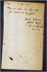 Simon Sulzer, Schweizer Reformator (1508-1585), eigenhändiges Stammbuchblatt, Basel 15. November 1569. Lateinische Handschrift auf Papier, ½ S., ca. 16,8 × 10,2 cm. Altersgebräunt, etwas braunfleckig, links unregelmäßig beschnitten, rückseitig zwei Ecken mit Kleberesten (war alt montiert), Bleistiftnotizen. - € 600