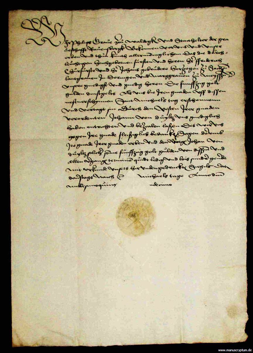 Dekorative Urkunde, in der der Graf bestätigt, durch Johannes von Dölitz 50 Goldgulden Dienstgeld von den "Dürchleuchtigen hochgebornen Fürsten und Herren Herr Friderich Churfürste und Herr Johans Gebrudere Hertzogen zu Sachsen", also von Friedrich dem Weisen (1463-1525) und Johann dem Beständigen (1468-1532) von Sachsen, erhalten zu haben.