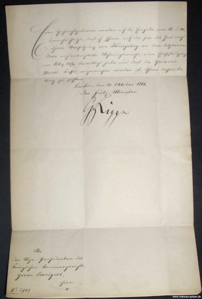Als preußischer Justizminister an den Vize-Präsidenten des königlichen Kammergerichts, Zweigert, dem er mit-teilt, dass er die Generalstaatskasse angewiesen habe, Zweigert die von diesem, aufgrund seiner Versetzung nach Berlin, im vorherigen Dienstort Königsberg zuviel entrichteten Mietkosten zu erstatten.