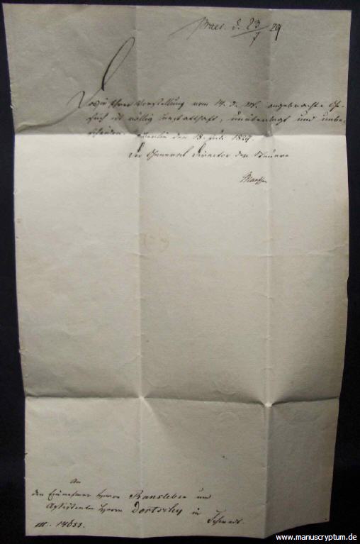 Karl Georg Maaßen, preußischer Politiker, Mitinitiator des Zollvereins, (1769-1834), Brief mit eigenhändiger Unterschrift, Berlin, 18. Juli 1829. Deutsche Handschrift auf Papier ("J.MR 1829"), ca. 33,8 × 21 cm, ¼S. auf 2 Bll. Mit rotem Lacksiegel. Zweites Blatt mit öffnungsbedingtem Randausriss, kleine Löcher an Faltstellen, minimal angeschmutzt. - € 120.