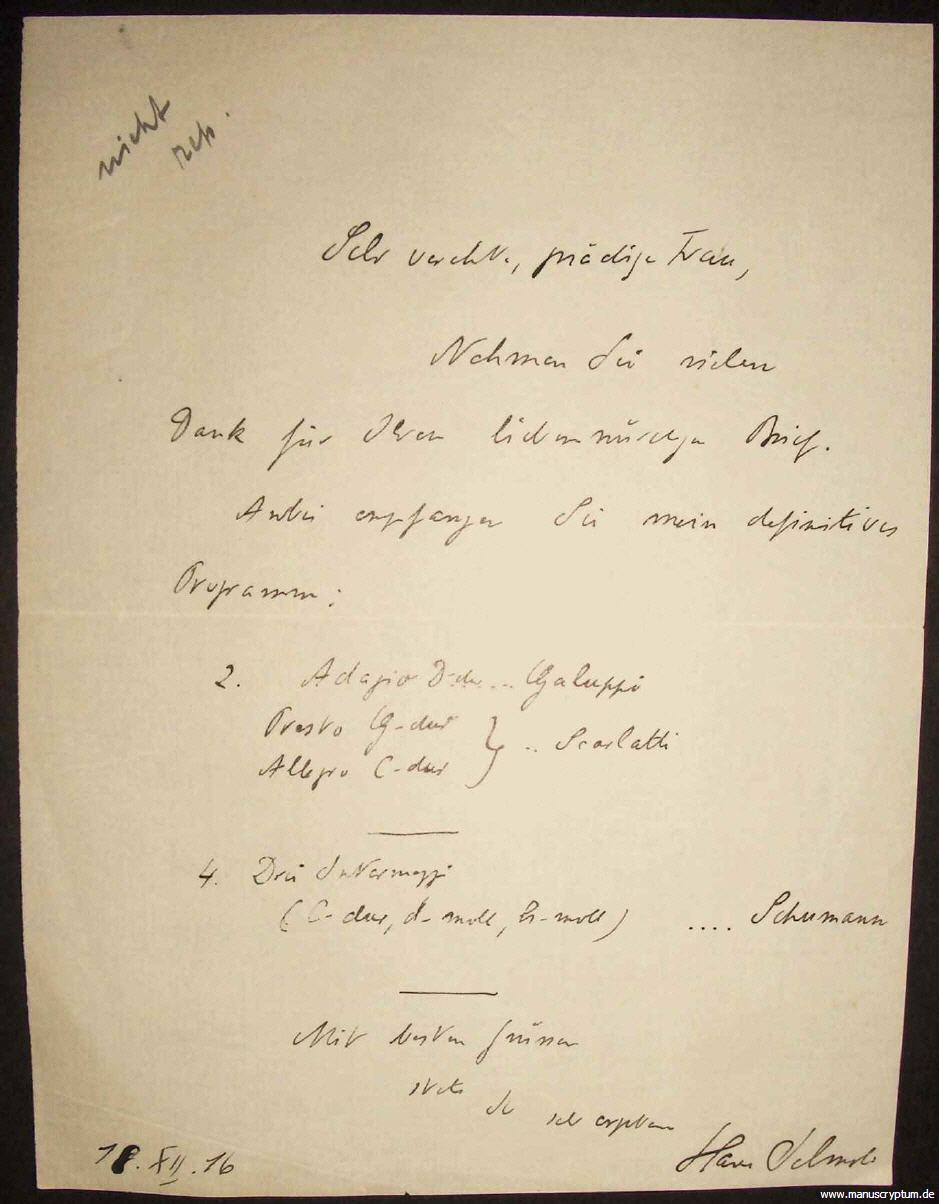 Hans Jelmoli, Schweizer Komponist und Pianist (1877-1936). Eigenhändiger Brief mit Unterschrift, [Zürich?], 18. Dezember 1916. Deutsche Handschrift auf Papier, ca. 17,7 × 13,4 cm, 1 S. auf 1 Bl. - € 90.