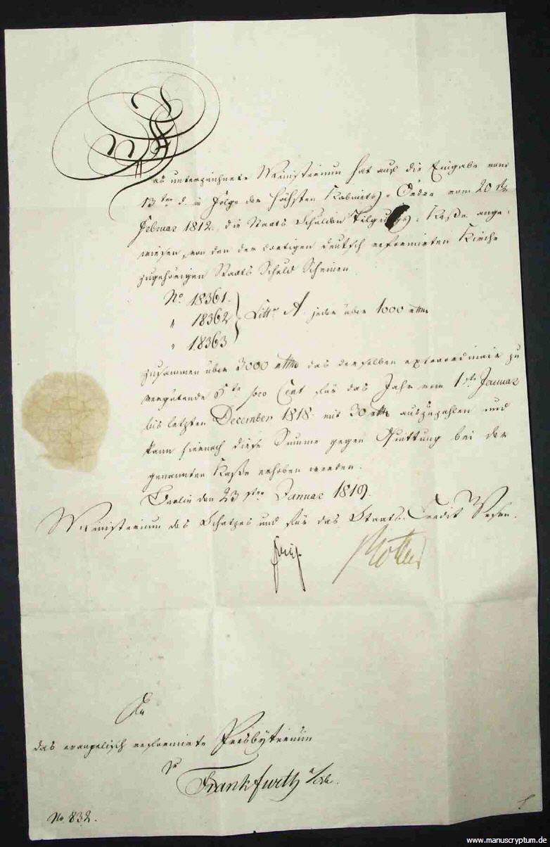 Christian von Rother, preußischer Bankier und Finanzpolitiker, verhinderte Preußens Bankrott, (1778-1849), Dienstbrief mit eigenhändiger Unterschrift, Berlin 23. Januar 1819. Deutsche Handschrift auf Papier ("A.D.V. & S", "Pro Patria"), ca. 32,3 × 20,5 cm, ¾ S. auf 2 Bll. Weitere Unterschrift von Karl Ferdinand Friese (1770-1837). Rotes Lacksiegel des preußischen Schatzministeriums. Minimal angeschmutzt. Zweites Blatt mit großer Eckfehlstelle. - € 250.